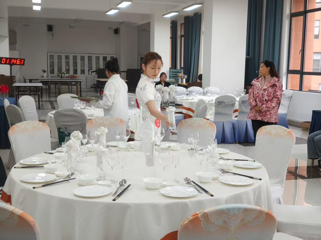 比赛率先在中式宴会摆台赛场拉开帷幕。16名参赛选手在主持人的有序引导下依次登台,铺台布、定间距、摆餐具、折口布,一系列操作手法娴熟规范、神情从容自信。选手们严格遵循行业标准,兼顾实用性与美学设计,将课堂所学与实践操作深度融合,在规定时间内完成了一套套布局合理、格调雅致的宴会摆台作品。