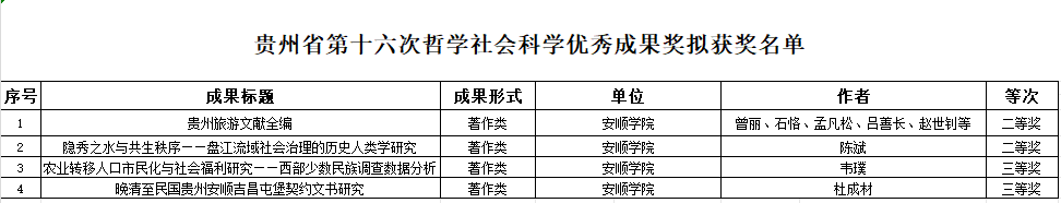其中,曾丽、石恪、孟凡松、吕善长、赵世钊等老师的著作《贵州旅游文献全编》,陈斌老师的著作《隐秀之水与共生秩序——盘江流域社会治理的历史人类学研究》拟获二等奖;韦璞老师的著作《农业转移人口市民化与社会福利研究——西部少数民族调查数据分析》,杜成材老师的著作《晚清至民国贵州安顺吉昌屯堡契约文书研究》拟获三等奖。