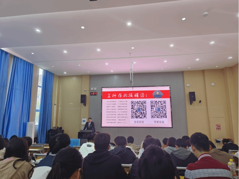 2024年5月9日下午2点半,中国工商银行安顺市西航路支行受邀到旅游学院开展了2场反诈骗宣讲活动。活动在顺理楼128阶梯教室开展,旅游学院2022、2023级近300名学生参加了活动。