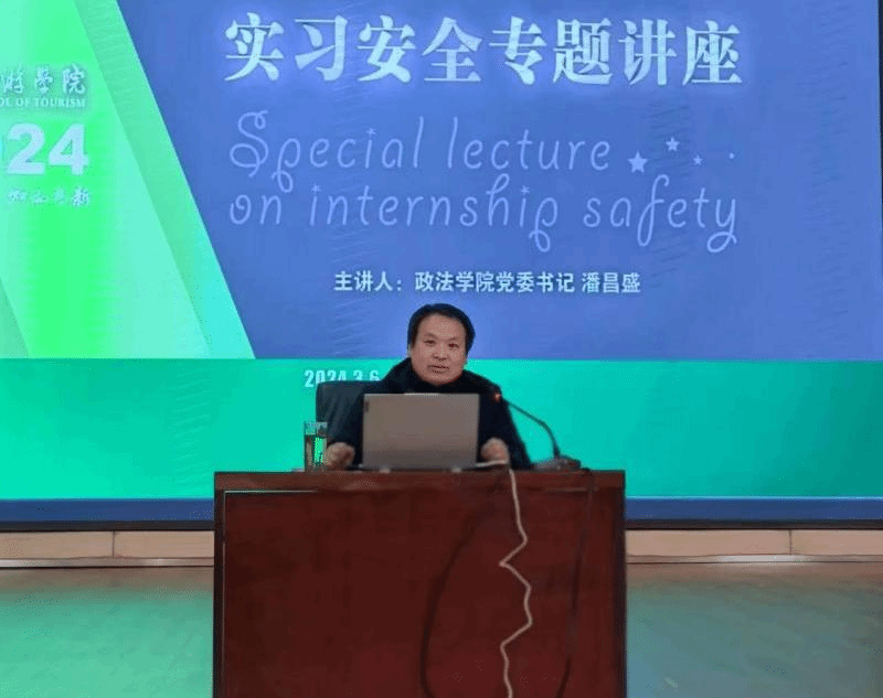 为确保旅游学院学生在专业实习期间能够安全稳定地完成实习任务,保障实习生身心安全,掌握系统安全知识,使学生注意实习期间的安全事项,2024年3月6日下午,2021级全体学生在学术报告厅参加“实习安全专题讲座”,主讲人为政法学院党委书记潘昌盛。