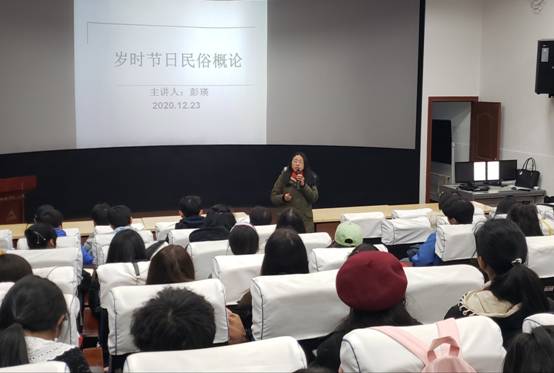 2020年12月23日晚上19∶00点,我院在A02实训室举办了“岁时节日”专业培养第二课堂知识专题讲座,主讲人为我院副院长彭瑛,2019级旅游管理班全体同学聆听了讲座。
