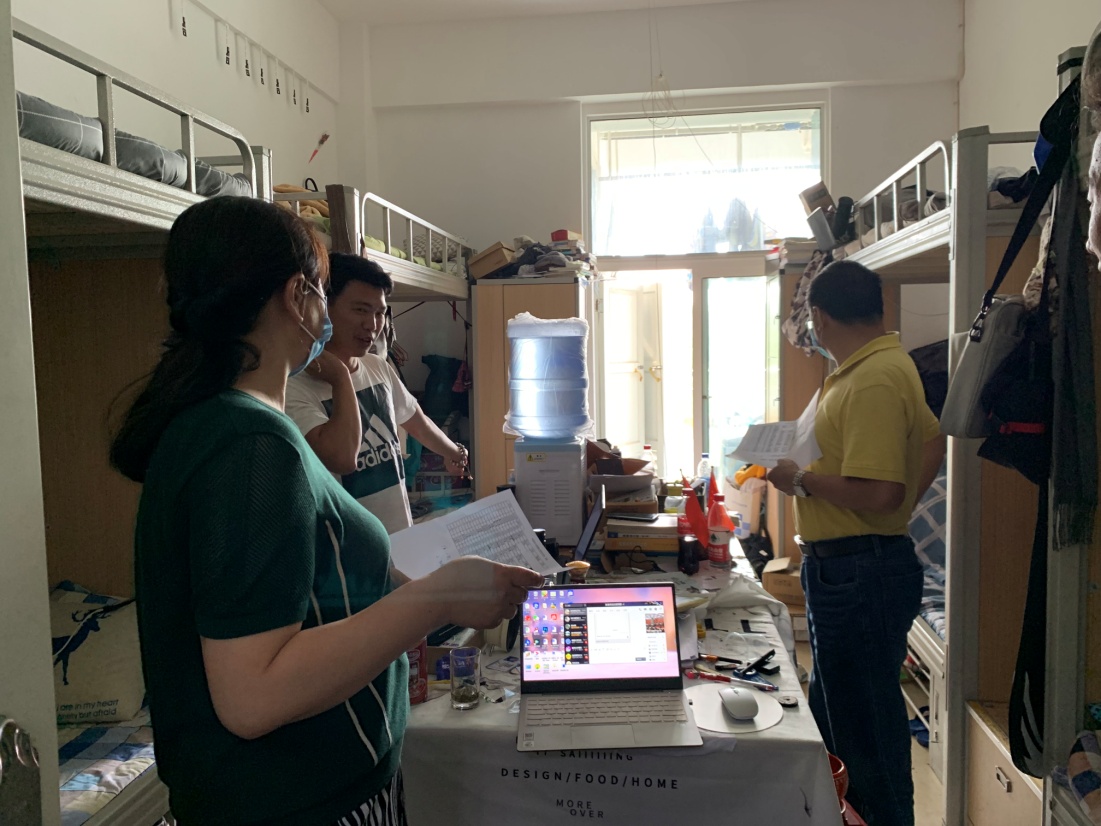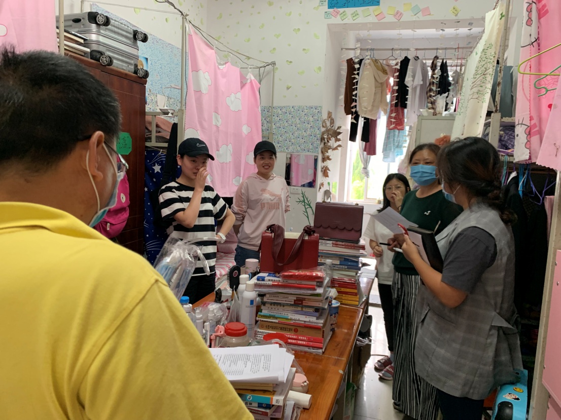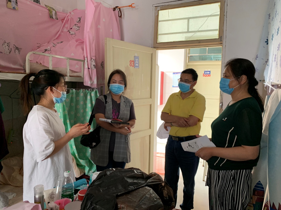 2020年5月11日下午16:00,我院党委书记龚文静及专职副书记赵世钊,带队走访毕业生寝室了解毕业生到校及入住情况,毕业班代班主任陈莉华及辅导员付菡随行。