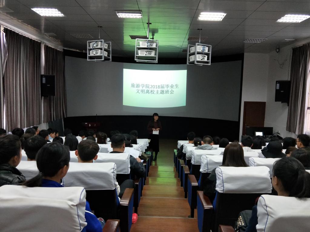 3月20日上午9点,我院在导游模拟实训室召开“旅游学院2018届毕业生文明离校主题班会”,2014级旅游管理班主任余红英、2014级文化产业管理班主任叶绘英、学院学生专职辅导员王振伟、2018届毕业生参加此次班会。