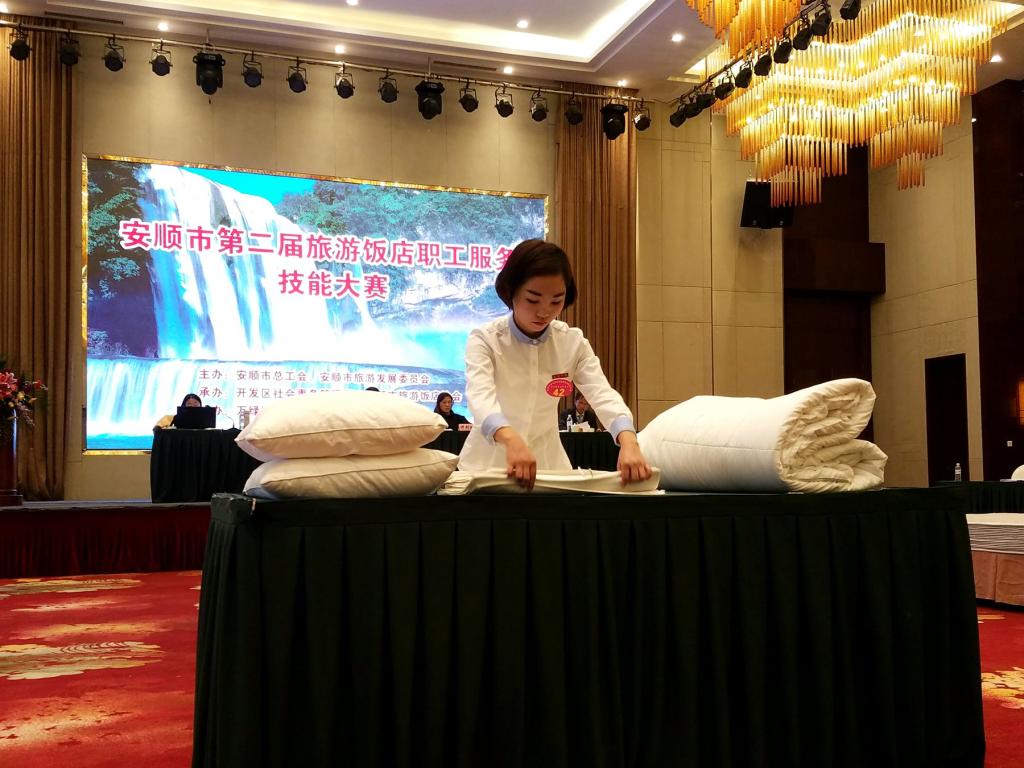 2016年12月16、17日,由安顺市旅游发展委员会、安顺市总工会共同主办的安顺市第二届旅游饭店职工服务技能比赛在安顺万绿城铂瑞兹酒店举行。本次比赛分中式铺床、中餐摆台两个项目,参赛选手为安顺市辖区内25个旅游饭店职工,共计72人。大赛设个人奖和团队奖,奖励一等奖1名、二等奖2名、三等奖3名。