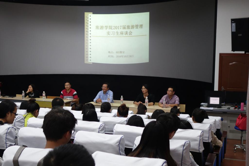 为进一步了解实习生的具体实习情况,2016年10月26日,我院在A02教室召开旅游管理专业实习生座谈会。参加座谈会的有2017届在酒店、旅行社、景区实习的共计85名实习生,我院院长吴羽、副院长赵世钊、办公室主任韦明顶以及相关教师出席座谈会。