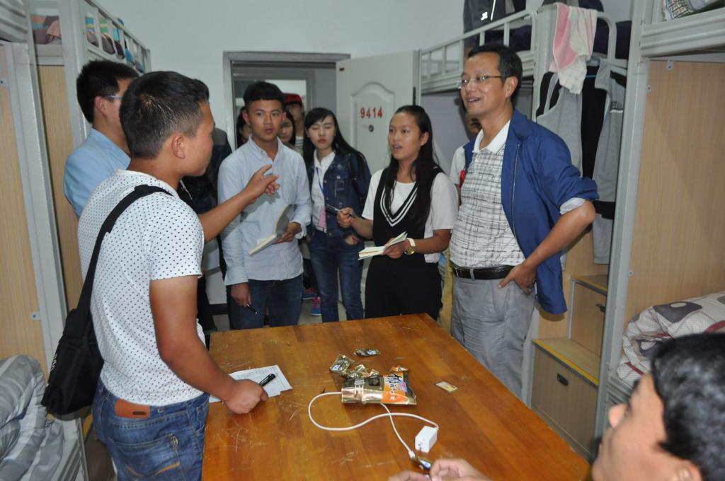 晚上8点,吴羽院长、辅导员王振伟老师带领团总支学生会部分成员走访新生宿舍,吴羽院长进入新生宿舍与新生常谈,亲切地询问新生来自哪里、家庭情况、是否习惯等,认真查看宿舍情况,并要求详细记录新生存在的问题,及时上报学校相关部门进行维修。