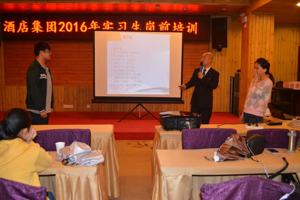 为了让实习生尽快完成角色转换、适应酒店的工作环境、掌握酒店服务技能,2016年3月21日至25日,黄果树酒店集团对我院实习生进行岗前培训。培训内容包含酒店基础知识、企业文化、服务技能、酒店规章制度、安全生产、服务礼仪以及部门实操等。