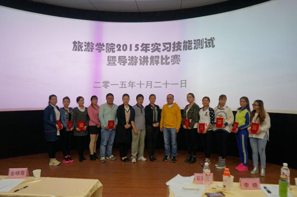 2015年10月21日,我院2015年实习技能测试暨导游讲解比赛在A02实训室举行。贵阳天悦旅行社导游部经理石园园,原安顺市委宣传部副部长、原安顺市社科联主席李晓,安顺市旅游局教育培训科科长金晓霞、黄果树导游服务公司经理何志娟、贵州资深导游邓绍钱出席活动并担任比赛评委。我院2016届在旅行社、景区实习的42名学生参加比赛。