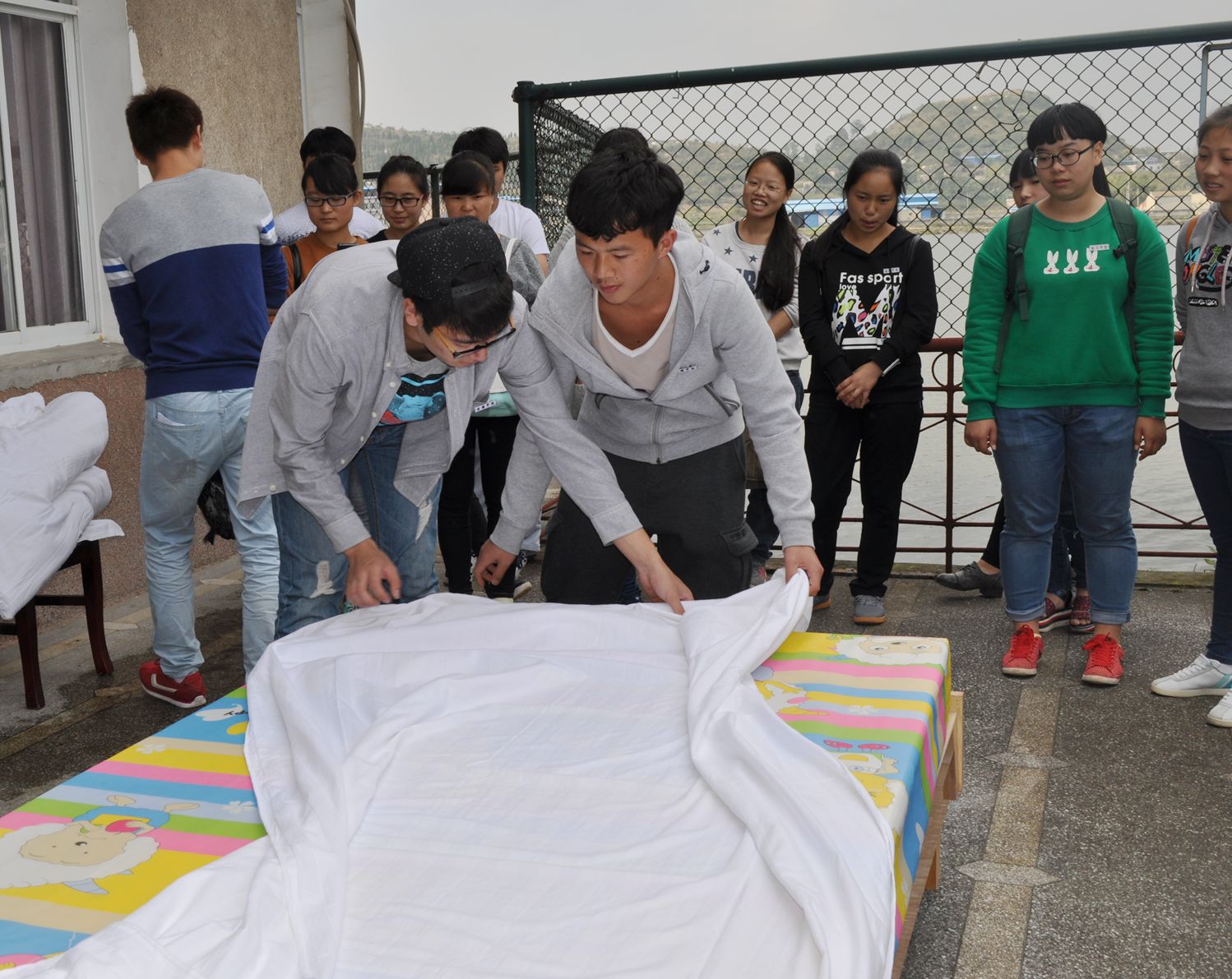 2015年10月19日中午14:00,我院在水管所实训室举办礼仪规范系列活动之一:中式铺床与礼仪展示。我院2015级2个班的102名同学及团总支学生会部分学生参加活动。