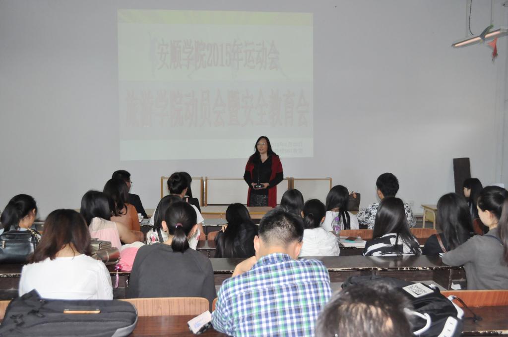 2015年5月20日,我院在电教楼951教室隆重举行校运会动员会暨安全教育大会。党总支书记蒋晓兰教授,辅导员王振伟老师、王兴社老师、余红英老师及2013级、2014级全体学生共计300余人参加了会议。大会由王振伟老师主持。