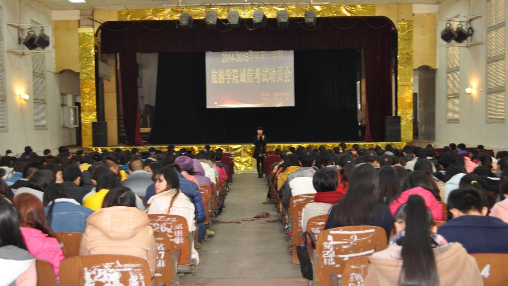 2014年12月19日下午,我院在学校大礼堂召开“2014-2015学年第一学期诚信考试动员会”。我院党总支书记胡赤兵副教授、教师代表陈斌、学生专职辅导员王振伟老师及全院四百余名学生共同参加了此次大会。