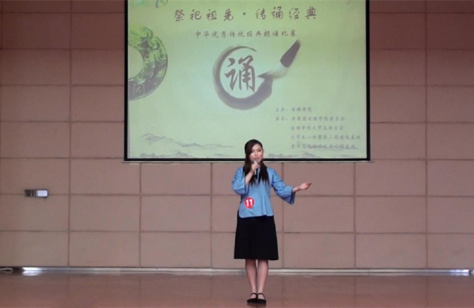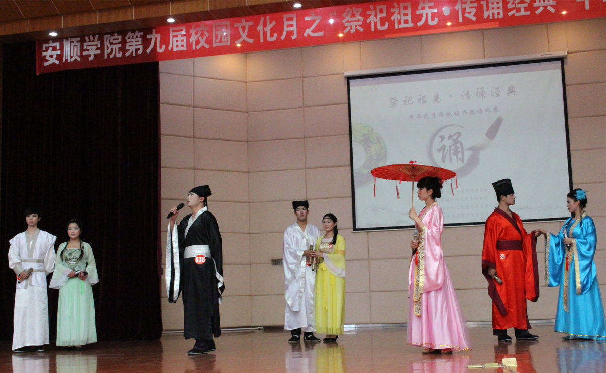 2014年5月21日至22日,由共青团安顺学院委员会举办的“2014年安顺学院校园文化月活动之‘祭祀祖先·传诵经典’中华优秀传统经典朗诵”比赛在学术报告厅举行。我院选派学生参加独诵和集体诵两个项目的比赛。