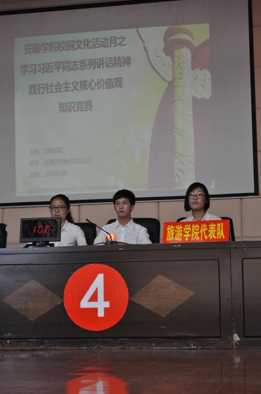 2014年4月17日下午,由安顺学院团委会主办、安顺学院素质拓展活动中心承办的学习“习近平同志系列重要讲话、践行社会主义核心价值观 ”知识竞赛在安顺学院学术报告厅举行。我院由2012级旅游管理本科班余明丽、刘媛媛和2013级旅游管理本科班孙波3名同学组成的代表队参加比赛。
