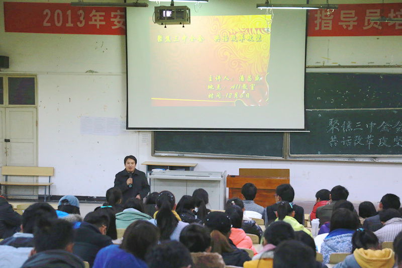 潘昌盛副教授从教育制度改革、“六个紧紧围绕”、全面深化改革的主要任务14项、我眼中的十八届三中全会等四个方面结合生活实际进行深入浅出的讲解。