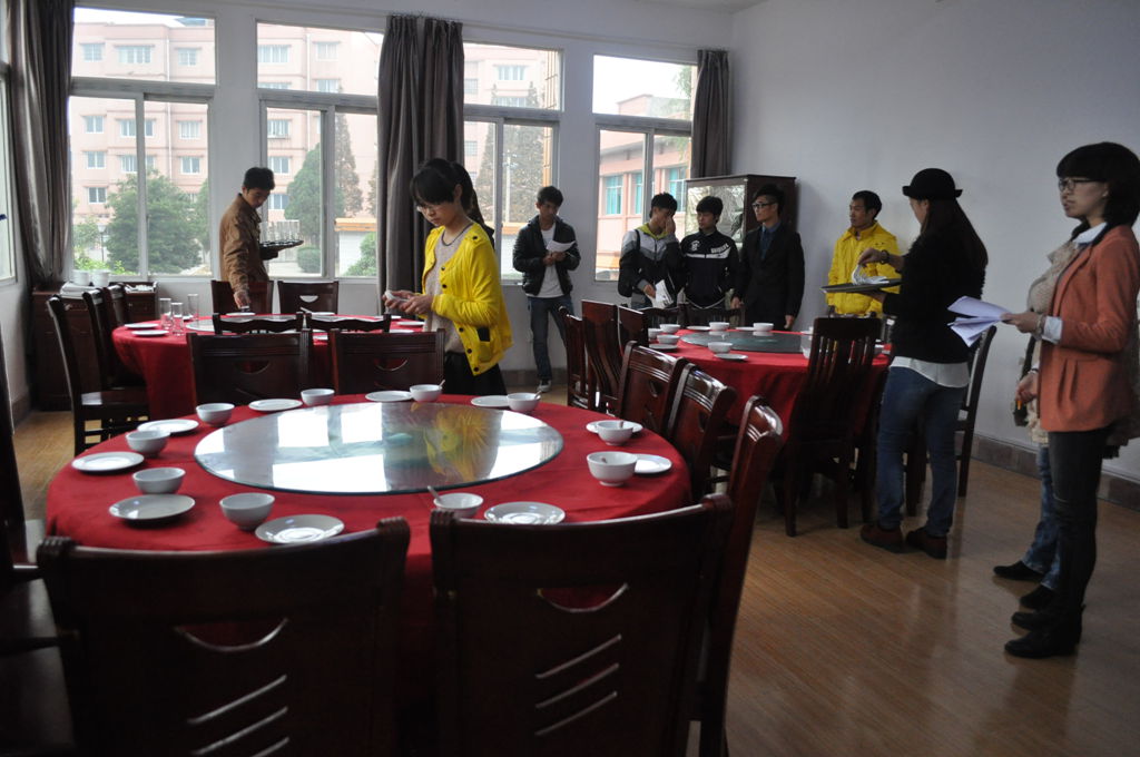 展示分为中餐摆台、中式铺床和导游现场讲解,学生按照实习单位分为导游、酒店餐饮和酒店客房三个小组,通过实际操作和模拟情景的方式分别展示实习岗位的基本技能;教师依据专业方向分组担任评委,对学生的实际操作进行现场打分。