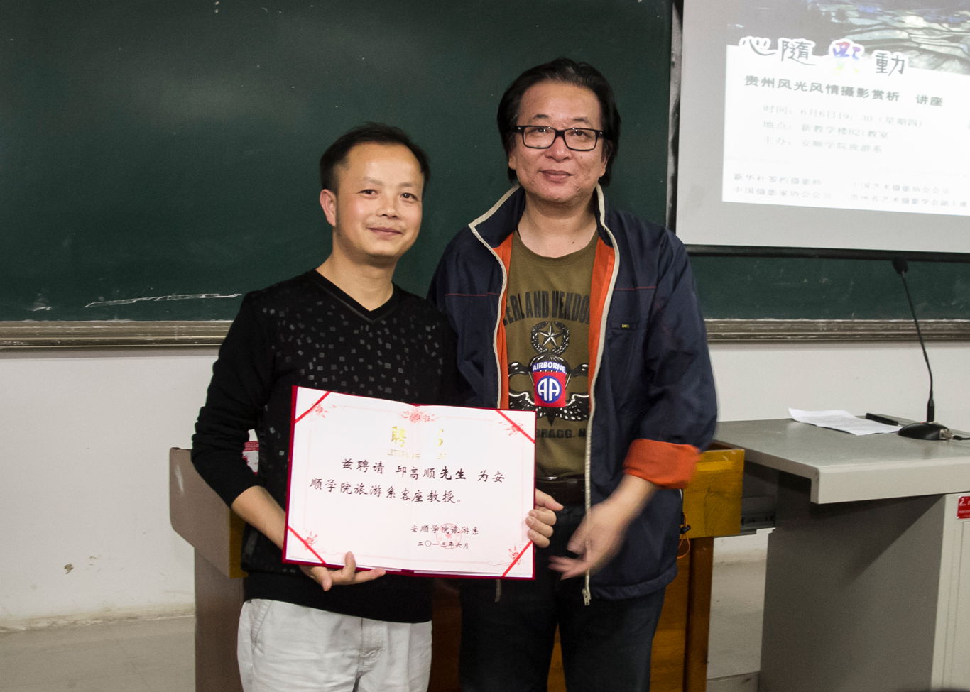 6月6日晚,新华社签约摄影师、贵州省艺术摄影学会副主席、贵州省青年摄影家协会副主席邱高顺先生应邀在我校B32教室举办“心随影动——贵州风光风情摄影赏析”讲座。院长李建军教授出席讲座并向邱高顺先生颁发旅游系客座教授聘书,我系副主任吴羽教授、党总支副书记蒋晓昀教授,我系师生及众多摄影爱好者聆听讲座。