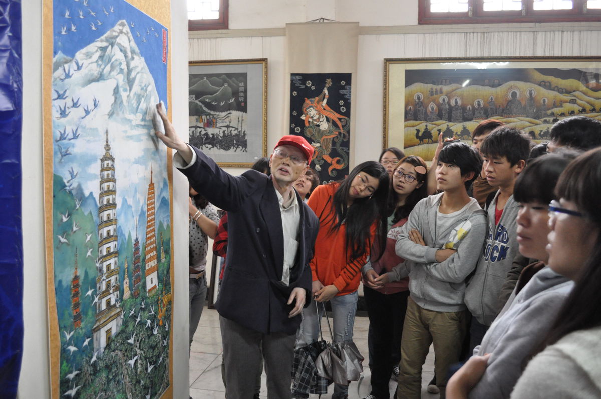 洪福远先生(左一)为学生讲解蜡染作品