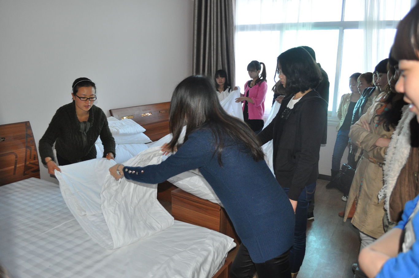 为了让学生尽快适应实习岗位的需求,我系在开学初即安排专业教师、已实习过的学生为即将实习的学生进行培训,内容包括酒店餐饮、客房、前厅服务,旅行社业务,导游讲解业务,劳动法律法规,服务礼仪。