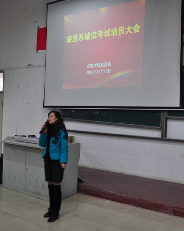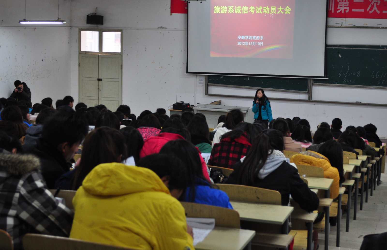 为了贯彻《安顺学院学生管理实施细则》,维护我校正常的教育教学秩序和生活秩序,12月10日下午,我系在A11教室召开了“2012年旅游系诚信考试动员大会”。全系300多名师生参加了此次会议。