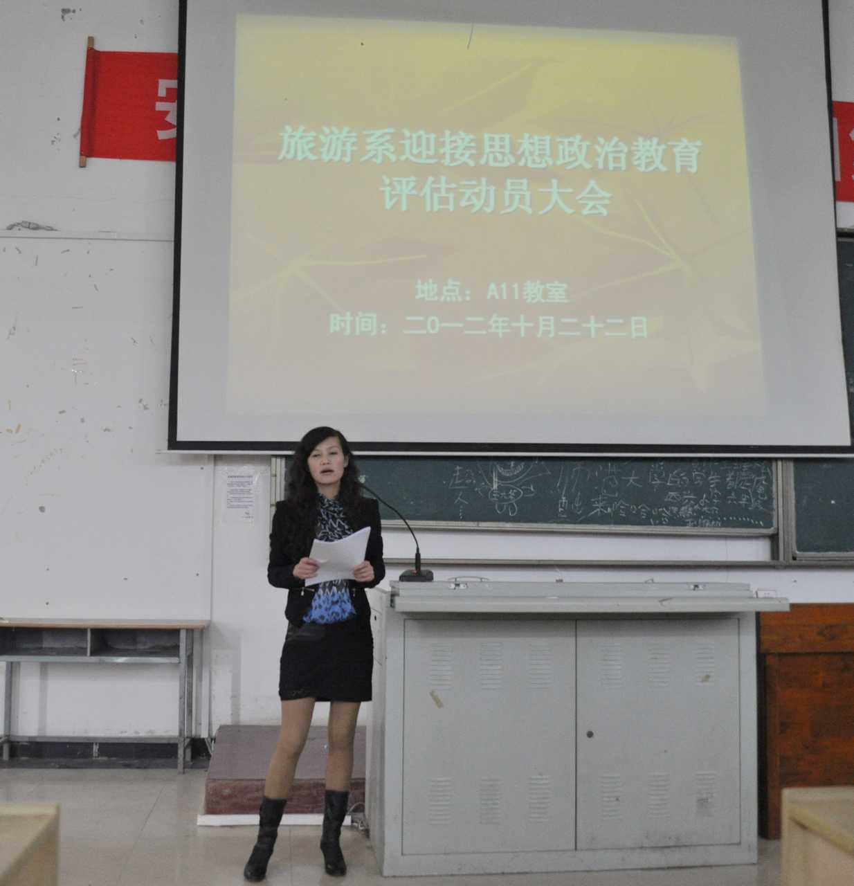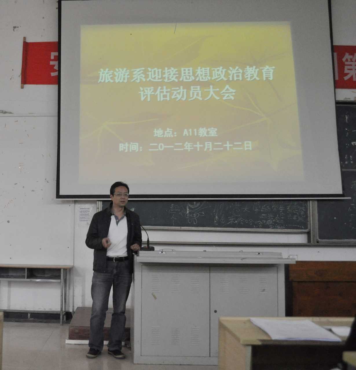 2012年10月22日,我系迎接思想政治教育评估动员大会在新教学楼A11教室举行。会议由朱敏老师主持,系党总支副书记、副主任吴羽教授,系党总支副书记蒋晓昀副教授分别发表讲话,全系师生参与会议。