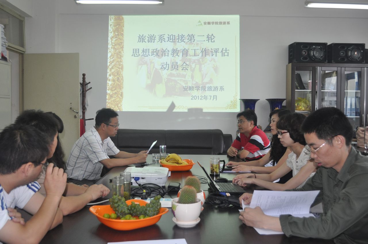 为做好第二轮思想政治教育评估工作的迎评工作,根据安顺学院办公室关于印发《安顺学院迎接第二轮思想政治教育工作评估工作方案》和《安顺学院第二轮思想政治教育工作评估指标体系任务分解表》(安学院党办发【2012】24号)文件精神,我系于2012年7月11日召开迎评动员大会,我系副主任吴羽教授、党总支副书记蒋晓昀副教授、办公室主任赵世钊副教授,以及系上的辅导员、班主任参加了会议。