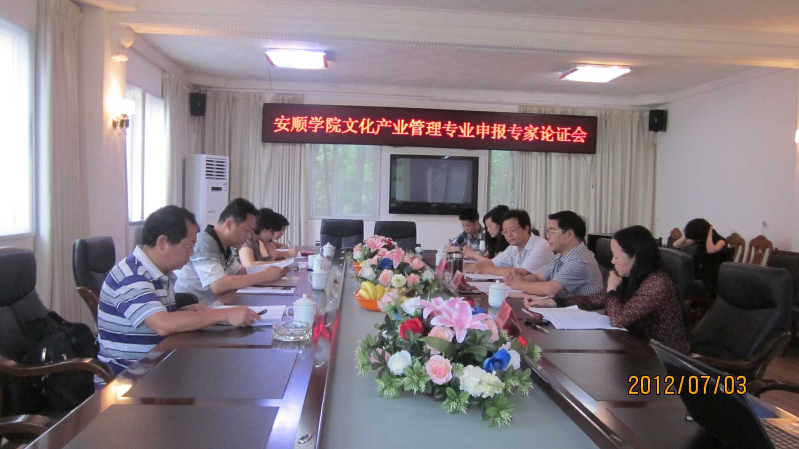 2012年7月3日上午,我系在学校行政楼二楼会议室召开文化产业管理新增专业专家论证会。出席会议的专家有安顺市旅游与体育局局长薛奎先生、黄果树集团公司总经理周云虹女士、安顺市文化产业办公室主任高守应先生、我校副校长王芳恒教授,我校教务处长支敏教授应邀出席会议,我系副主任吴羽教授、党总支副书记蒋晓昀副教授及部分教师参会。