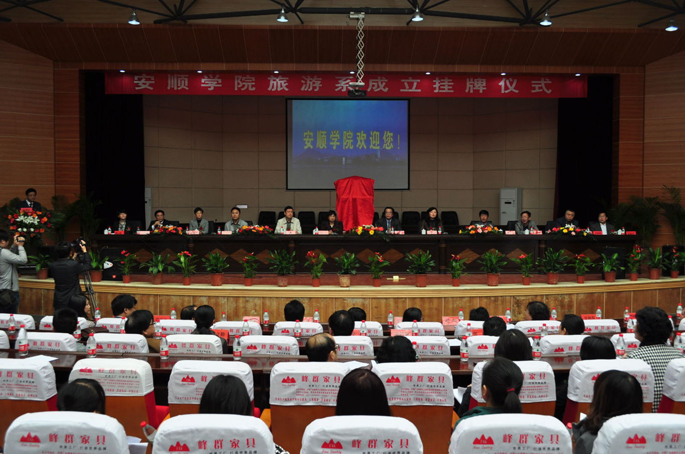 2011年4月22日上午十点半,我系在安顺学院学术报告厅举行成立挂牌仪式。参加揭牌仪式的嘉宾有:安顺市委常委、市委宣传部部长颜学丽,安顺市人民政府副市长廖晓龙,安顺市委宣传部常务副部长、市社科联主席薛奎,安顺市人民政府副秘书长王晓宁,市文化局局长邹正明,市旅游局副局长罗华琴,市人力资源与社会保障局副局长赵明,市教育局副局长张琪,市社科联副主席班文锦,开发区管委会副主任林红,学院院长李建军教授,副院长熊国敏教授、王芳恒教授、令狐荣涛教授等相关领导;贵州大学文化产业与旅游学院副院长金颖若教授、贵州民族学院旅游与航空服务学院院长龚锐教授、贵州财经学院旅游管理学院院长邱询立教授,安顺职院旅游系主任谢玲玲等省内各大高校的专家学者;黄果树旅游集团股份有限公司副总经理周云虹,龙宫风景风景名胜区管理处处长王枫林,屯堡风景名胜区管理处处长吴忠平,格凸河风景名胜区管理处处长宋修琪,关岭化石群国家地质公园管理处处长蔡涛,关岭大峡谷景区管理处处长周维林等省内各大旅游景点的负责人;校内各系部的负责人。