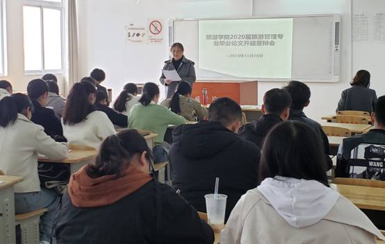 2019年11月16日,我院在特教大楼1107等教室举行2020届旅游管理专业本科毕业论文(设计)开题答辩会。我院院长吴羽、党委书记龚文静,安顺学院试验区中心主任娄昭、屯堡文化研究中心副主任吕燕平,我院副院长彭瑛、副书记赵世钊以及相关专业教师出席并担任答辩委员会教师,我院2020届旅游管理专业学生共计113人参加答辩。
