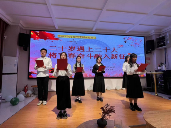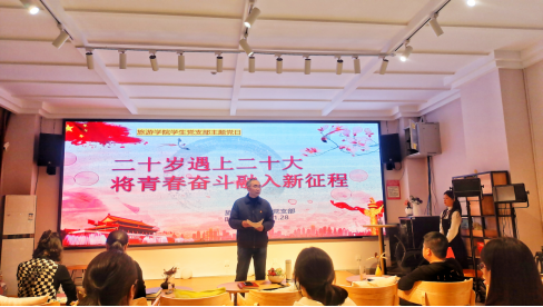 为深入学习贯彻党的二十大精神,培养青年学生的爱国热情,2022年11月28日下午4时,我院学生党支部在综合实训楼4楼旅游学院酒水实训室举行了“二十岁遇上二十大,将青春奋斗融入新征程”诗歌朗诵活动,出席活动的有安顺学院党委委员、组织部部长何朝越,我院党委书记龚文静,安顺学院组织部谢光林,以及我院学生党支部全体成员。