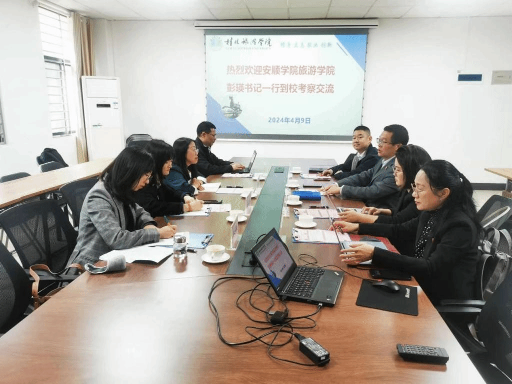 2024年4月9日,旅游学院党委书记彭瑛、酒店管理教研室主任朱敏,旅游管理教研室主任董天倩到桂林旅游学院旅游管理学院就实训室建设与管理、学科建设等主题开展交流座谈。座谈会由桂林旅游学院旅游管理学院院长高元衡主持,旅游数据学院副院长王春利,旅游管理专业教研室主任王新杰,酒店管理专业教研室主任谢新参与座谈。