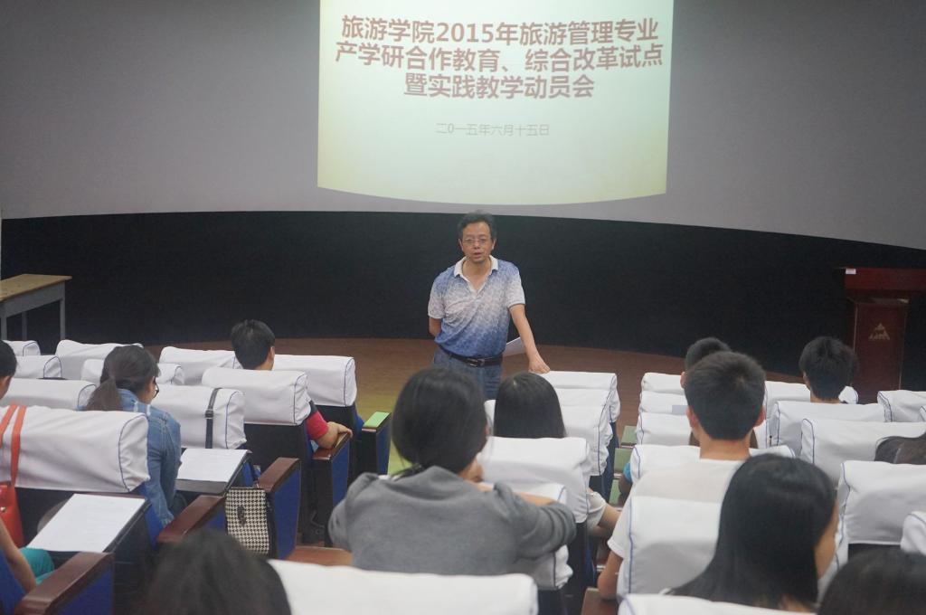 6月15日下午,我院在A02教室召开见习前的动员会。会上,我院院长吴羽,副院长赵世钊、潘昌盛等分别就见习期间的学习任务、安全保障、食宿等事宜进行做出了要求和交代,希望学生能充分利用此次见习的机会加深对旅游企业和社会的了解,加强理论学习与实践的结合。