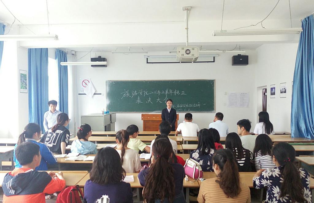2016年6月3日,我院党总支学生党支部在853教室召开预备党员转正暨支部委员调整大会。我院原党支部书记王振伟老师,辅导员王兴社老师、余红英老师及学院全体学生党员参加本次会议,会议由旅游学院学生党支部副书记王维一同志主持。
