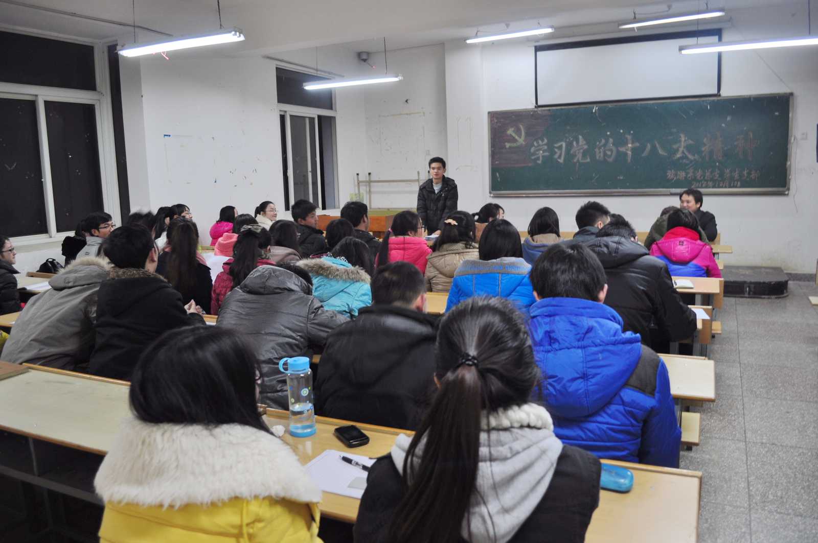 我系学生党支部全体学生党员于2012年12月10日晚在新教学楼853教室集体学习了党的十八大精神,会议由我系党总支学生党支部书记潘昌盛老师主持。