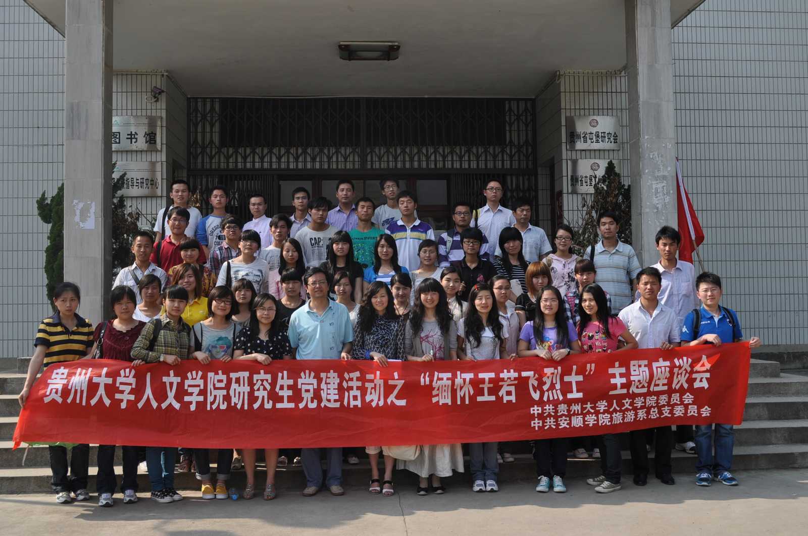 下午在我校853教室举行了以“学习革命先烈王若飞精神,促学生党建再提高”的主题座谈会。出席座谈会的有贵州大学的28位研究生和老师、我系领导、老师、系团支部书记及我系学生党支部同学。会议上,贵州大学陈老师、我系副主任吴羽教授分别发言。来自贵州大学的研究生代表畅谈了他们对爱国主义的理解和对先烈事迹的感悟。最后从实际生活出发,与我系同学就学习、考研、生活、情感,人生观、哲学道理等问题进行交流。