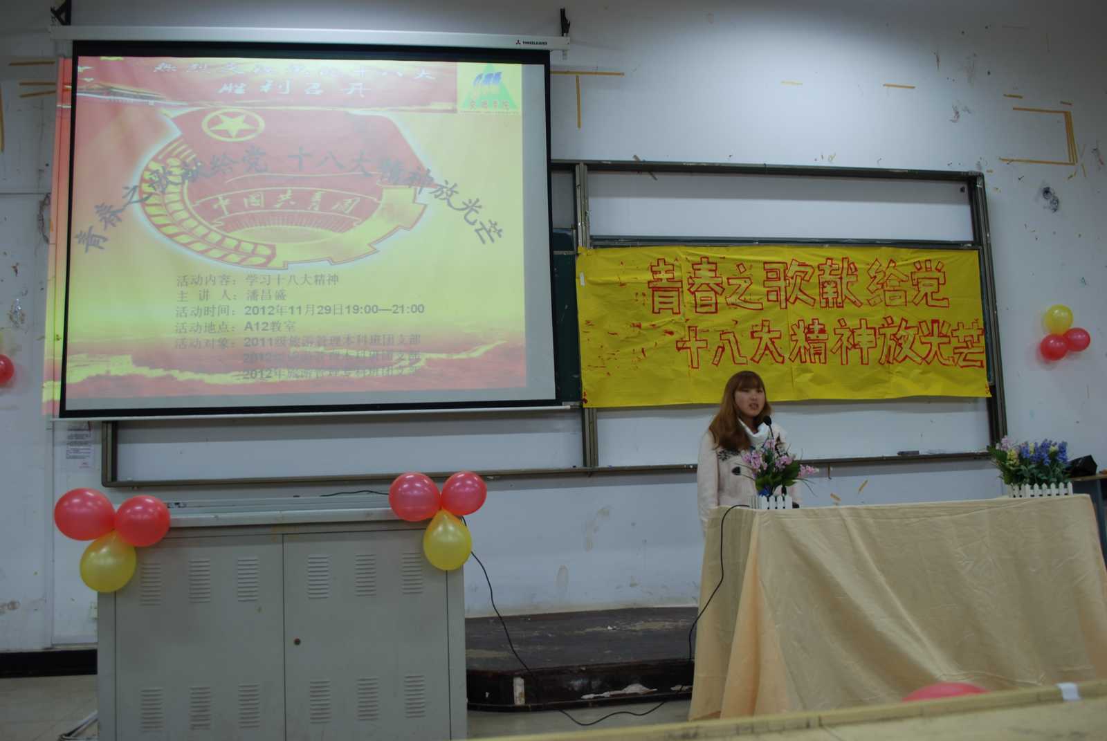 活动开始,陈斌老师首先发言,他希望每位同学要认真学习党的十八大的精神,从中吸取先进的理念来完善自己。接着我系辅导员潘昌盛老师带领全体同学共同学习了十八大报告,他要求同学们作为一个大学生,要时刻关注中国国情,同时将自己的人生观、价值观融入其中,明确学习目标,实现人生理想;最后,三个班的同学分别演唱了《红旗飘飘》、《团结就是力量》、《五星红旗》、《五十六个民族》等红色歌曲,将此次团组织生活推向了高潮。