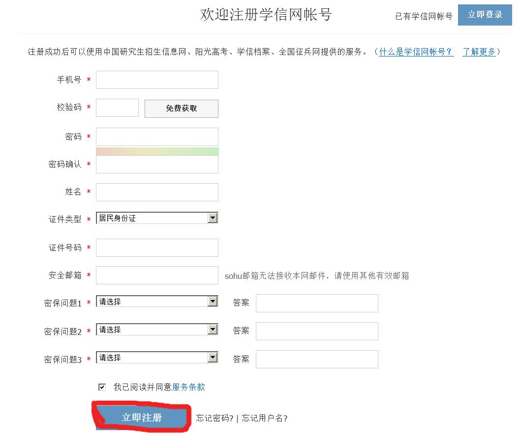 2、输入相关信息注册(必须填写真实的姓名及身份证号,否则学籍信息将不能链接),点击“立即注册”(注意:注册时的用户名和密码请一定牢记,否则今后将无法登录进行“学历图像校对”及“学历查询”等)。