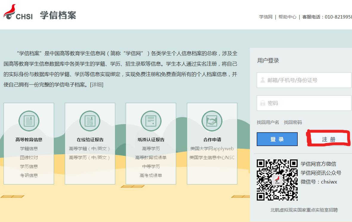 1、登录:全国普通高校学籍查询系统官方网站http://xjxl.chsi.com.cn/xscx.do如图。点击:注册。