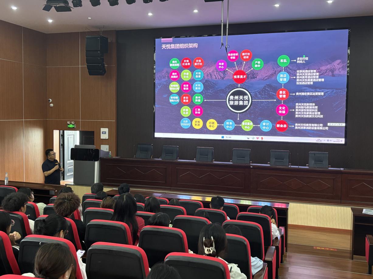 作为安顺学院杰出校友,王群富结合自身从旅游从业者到企业领航者的成长历程,深入剖析了贵州旅游产业从传统观光向文旅融合、智慧旅游转型的发展趋势。他围绕天悦集团打造的“产品体系框架”,强调“创新思维与本土文化结合”对职业发展的关键作用,并鼓励学生夯实专业基础,积极参与行业实践。