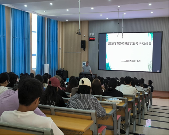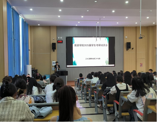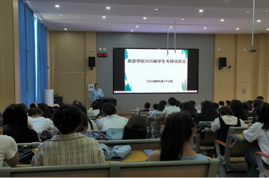 为发扬“咬定青山不放松”的优秀品质,鼓励学生坚持考研目标不动摇,不气馁,不放弃,提高我院整体考研率。2024年9月27日下午14:00—16:00,旅游学院在顺理楼阶梯教室128隆重举办了2021级考研动员大会。旅游学院党委书记彭瑛、专职副书记杜成材、副院长韦明顶及辅导员杨卓君与班主任代表夏长杙参加了动员大会。