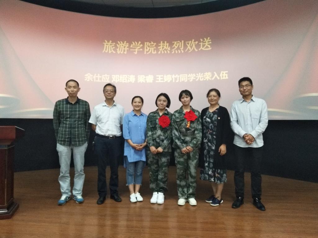 2019年9月11日下午14点,我院在导游模拟实训室A02举行了新兵入伍欢送会。本次会议由王兴社老师主持,党委书记龚文静,院长吴羽,杜成材老师、汪莉老师及2017级旅游管理班全体同学参与欢送会。