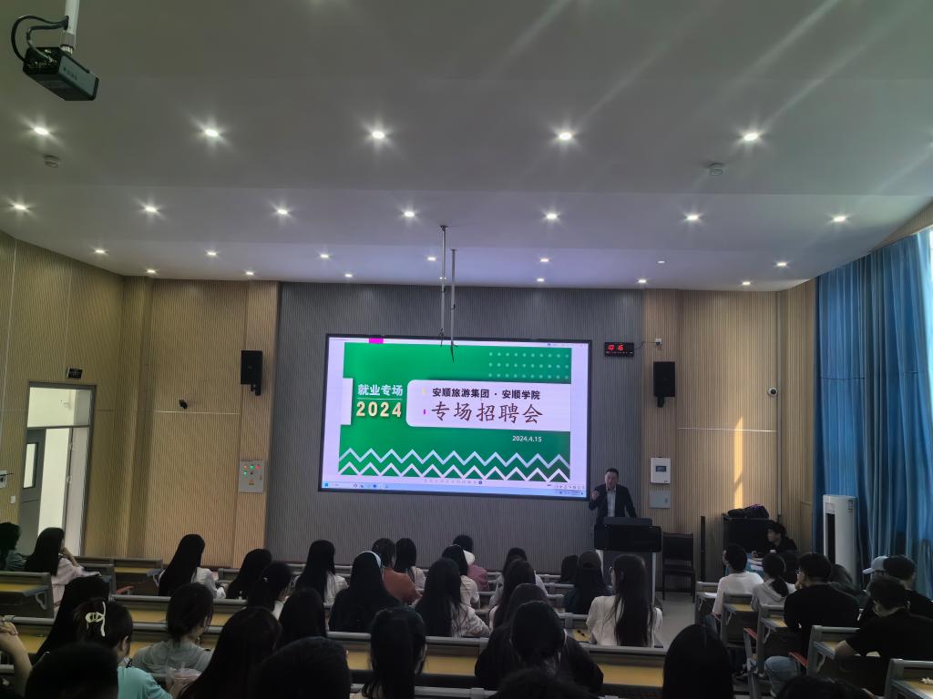 为深化校企合作,拓宽毕业生就业渠道,推动旅游业人才与市场的精准对接,2024年4月15日上午10点,安顺旅游集团文旅融合创新研究有限责任公司副总经理佟海峰、副总经理周海英和办公室主任欧阳羽泓受邀到旅游学院举办专场招聘会。旅游学院党委书记彭瑛、学生科科长王兴社及2020级全体毕业生参加了招聘会。