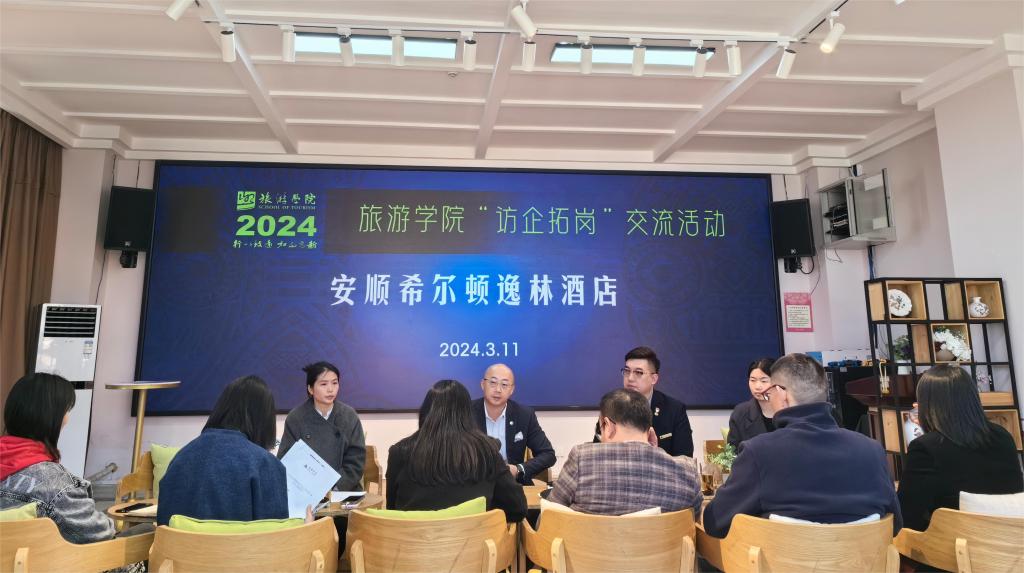 2024年3月7至3月13日,旅游学院在酒水实训室开展了“访企拓岗”系列活动。旅游学院先后邀请了温州阿外楼度假酒店、杭州千岛湖滨江希尔顿度假酒店、贵阳东景希尔顿酒店、安顺希尔顿逸林酒店、尧珈品牌民宿、贵州天悦旅游集团、贵州黄果树旅行社、酒九玖旅行社、中壹贝山商贸有限公司等企业负责人到校进行“访企拓岗”系列活动。旅游学院党委书记彭瑛、党委专职副书记韦明顶、副院长杜成材、旅游管理专业教研室主任董天倩、酒店管理专业教研室主任朱敏、文化产业管理专业教研室主任方莹以及部分老师参加活动。