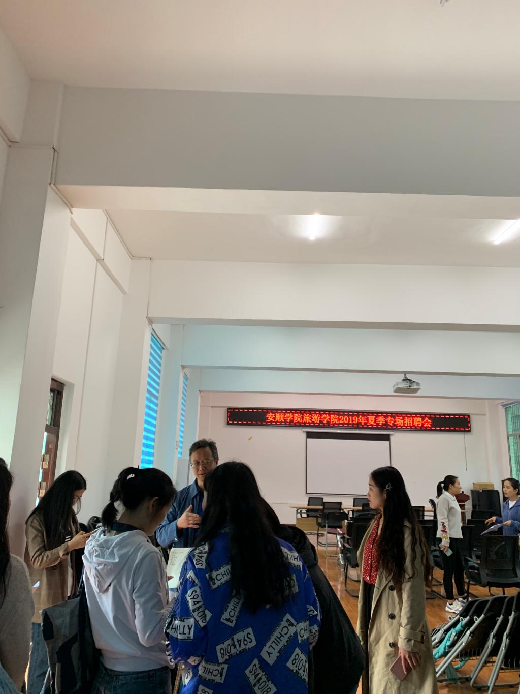 2019年5月13日下午16点,我院在电教大楼1楼招聘大厅与农学院联合举办了就业双选会,来自高荡景区、归山人户外旅行社和西秀区工投公司三家单位参加了本次现场招聘,共为毕业生提供了近20个就业岗位。我院党委书记龚文静、院长吴羽、我院部分老师以及2015级部分毕业生参加了此次招聘会。